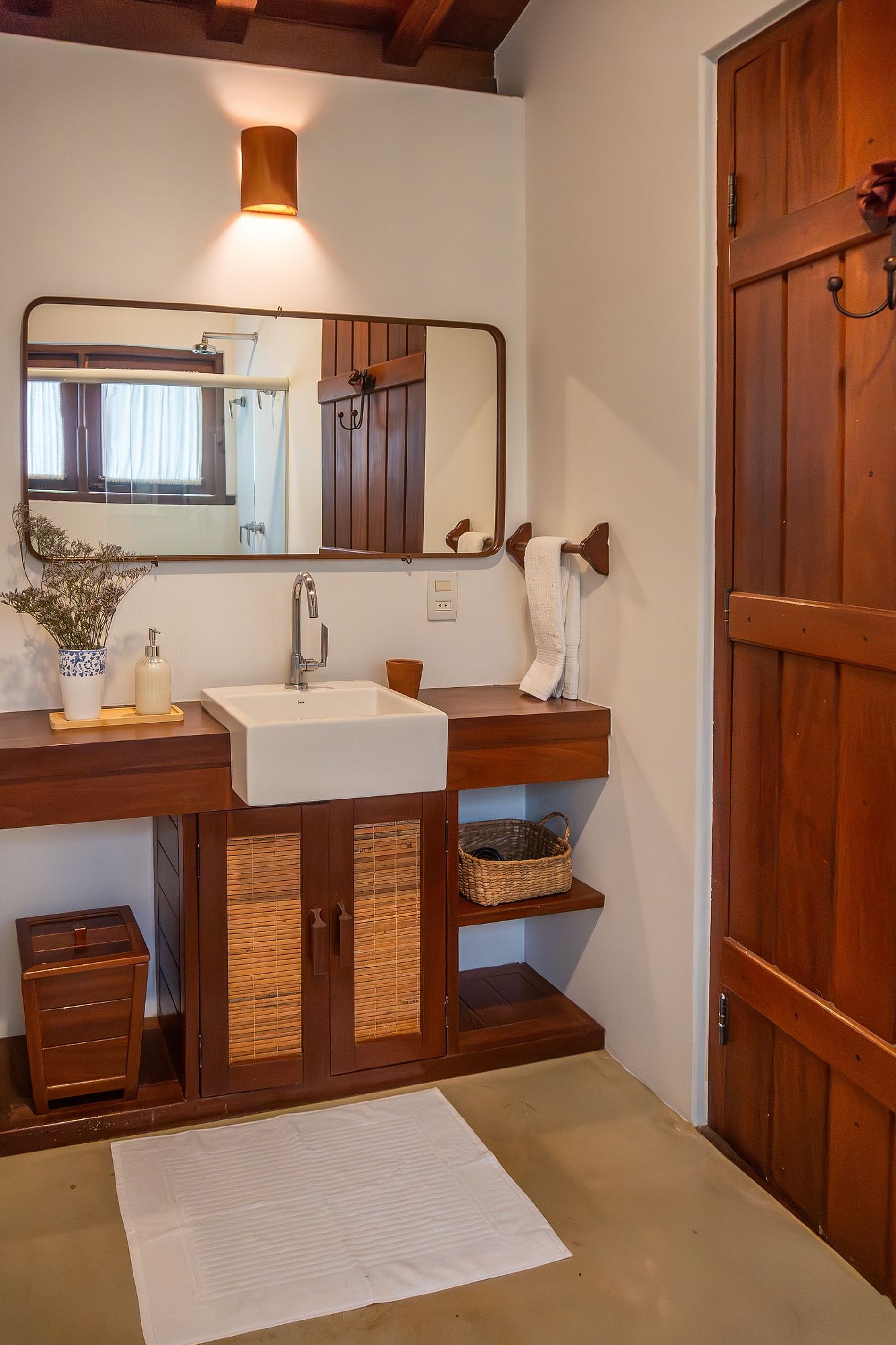 La decoración está inspirada en la isla de Bali, con un toque rústico y elegante típico del sur de Bahía. Maderas nobles, barro y paja son elementos presentes en todo el espacio, brindando frescura y un clima tropical característico de la región.