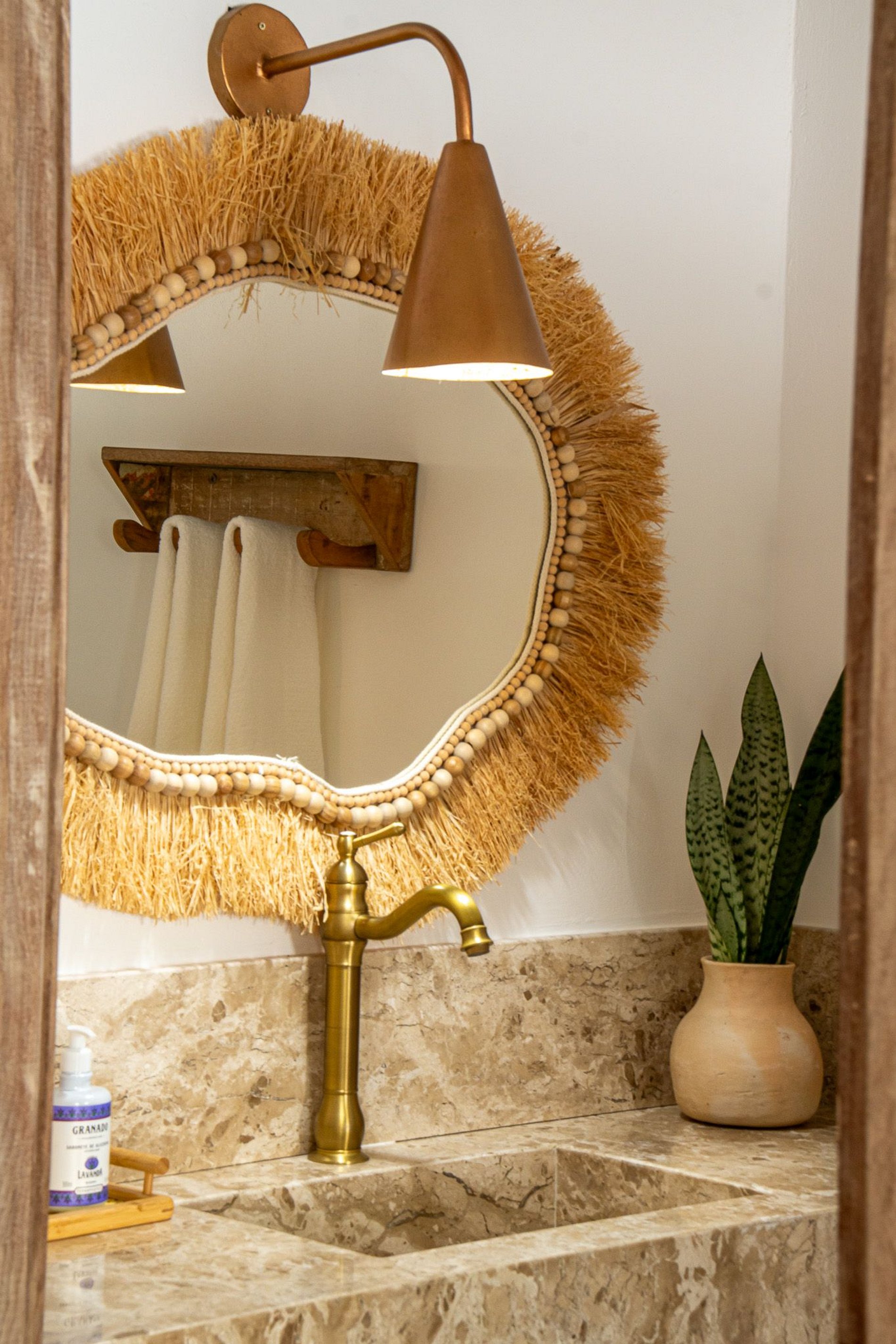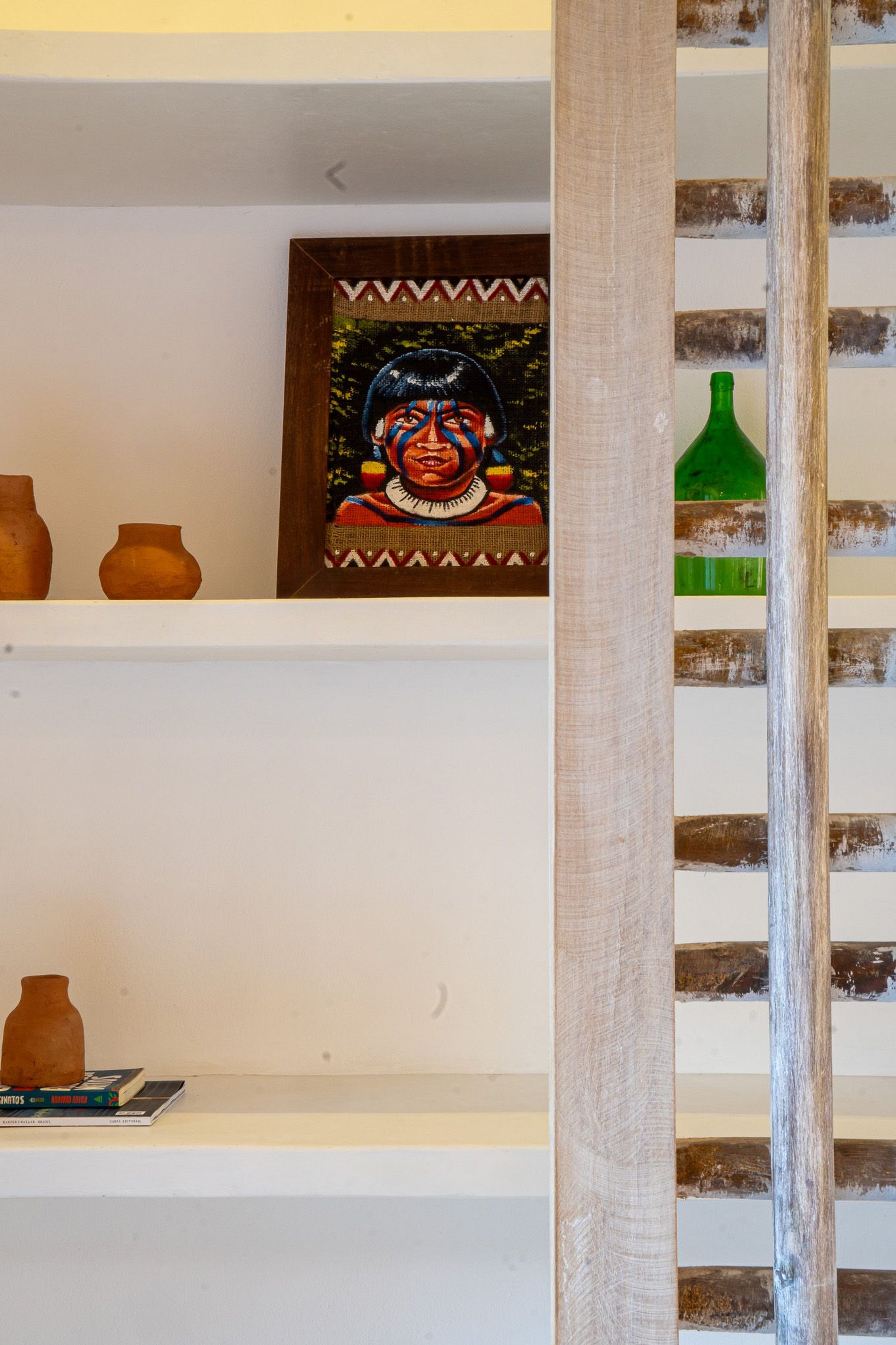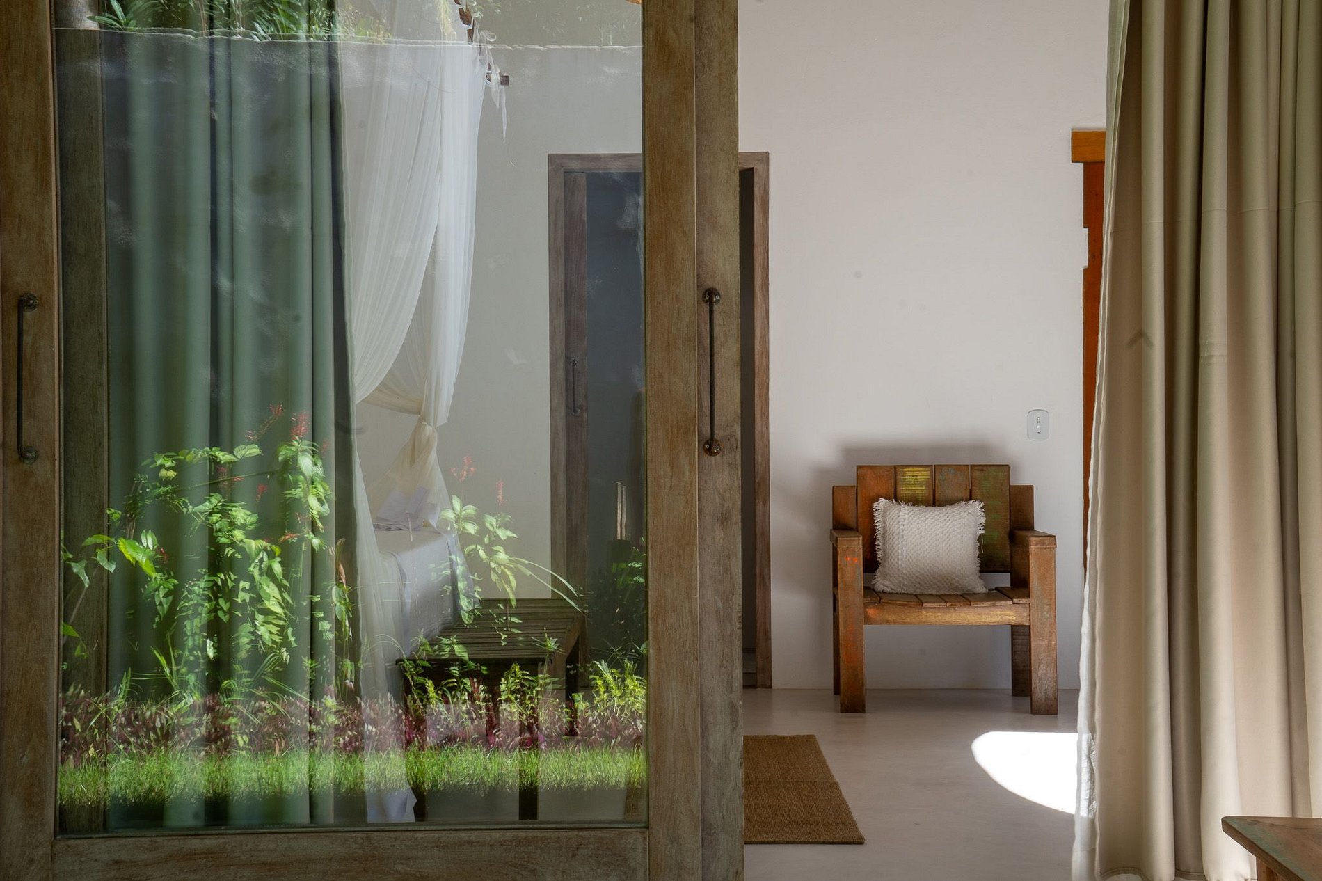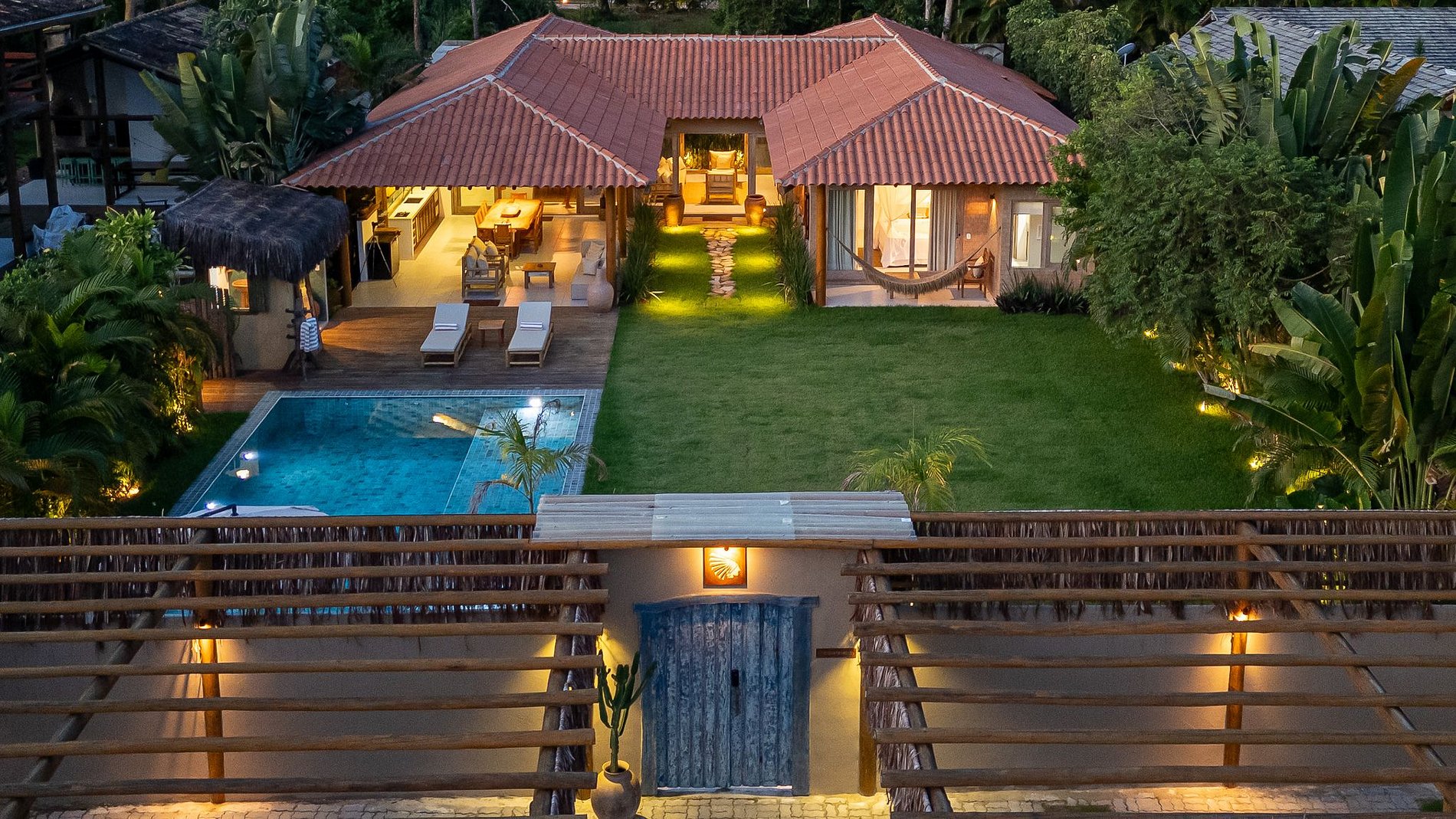 Construída com materiais naturais e técnicas tradicionais, a casa traz elementos como eucalipto, piaçava, cimento queimado e madeira de demolição, além de portais típicos de Trancoso, criando um ambiente autêntico, leve e sofisticado.