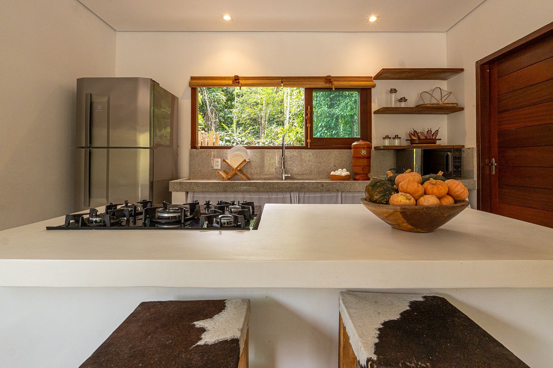 - Sala de estar, cozinha equipada e integrada com sala de jantar no interior da casa.